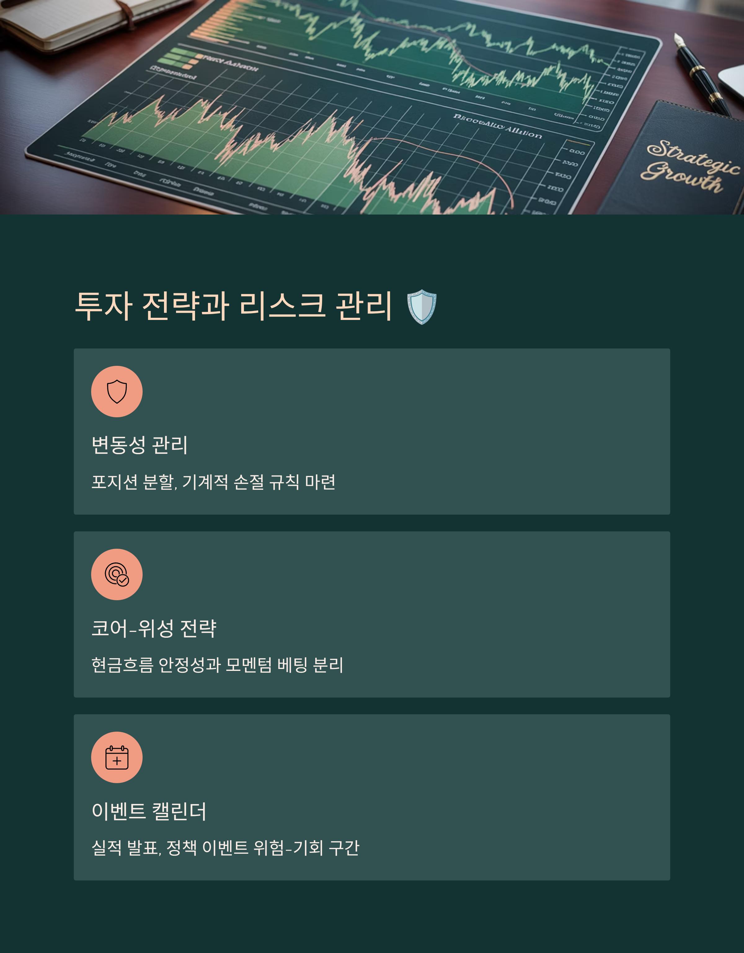 현금흐름 창출력과 밸류 안정성이 높은 코어 보유 자산과, 모멘텀 베팅에 적합한 위성 자산을 분리해 운용하면 심리·변동 관리가 쉬워요. 코어는 장기 경쟁우위와 진입장벽, 위성은 이벤트 드리븐과 기술적 패턴 위주로 기준을 달리하는 접근이 효율적이에요.
