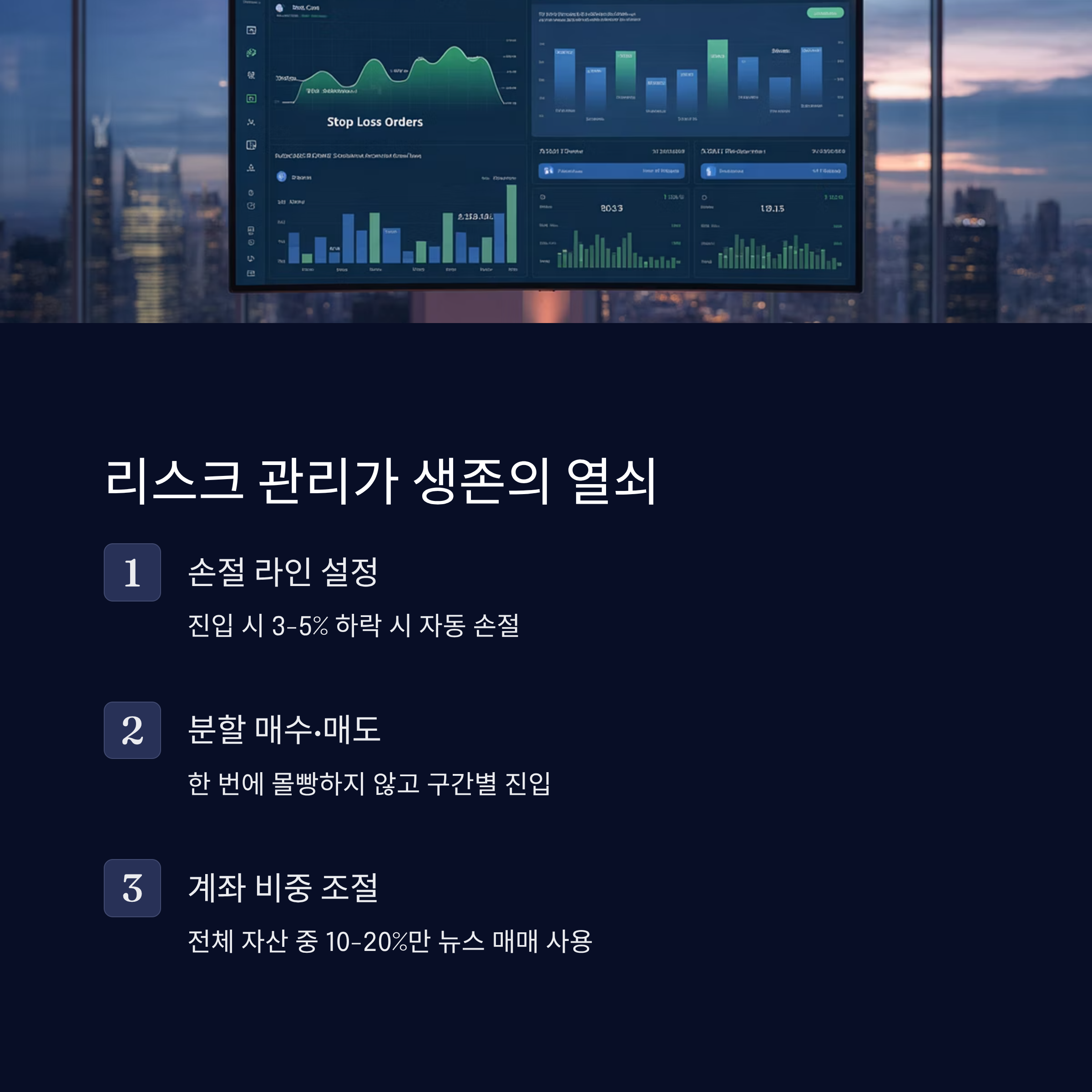 뉴스 매매는 무조건 수익보단 '리스크 통제력'이 우선이에요. 안전하게 오래 살아남는 게 진짜 실력이에요. 🔒