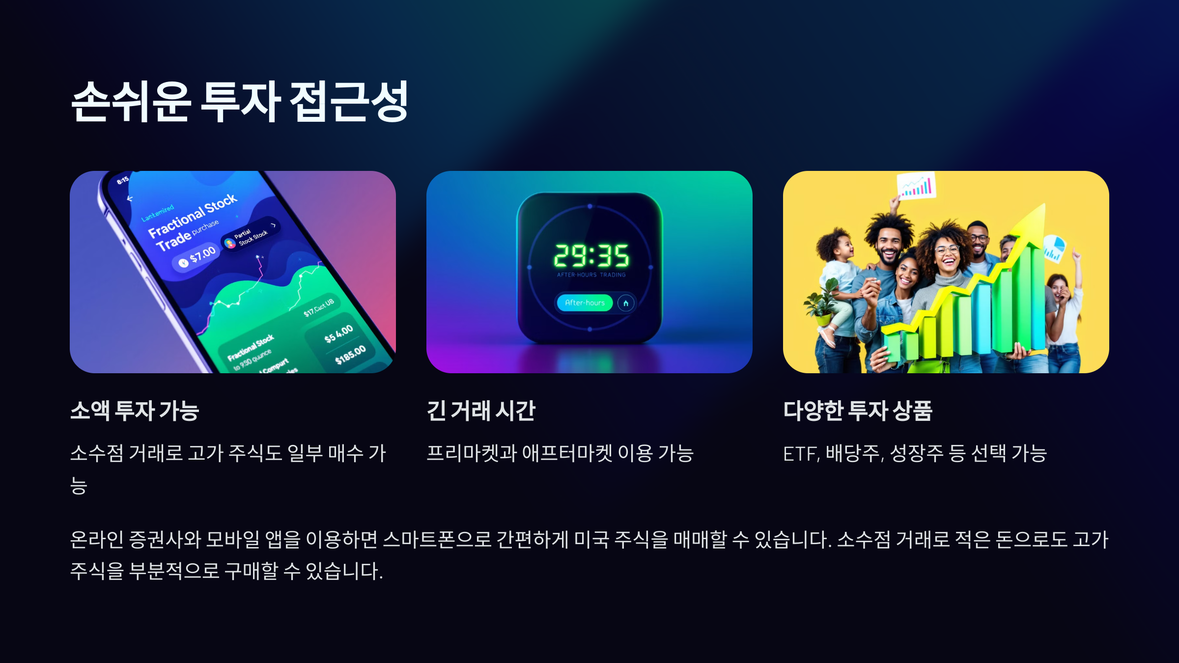 | 다양한 투자 상품 | ETF, 배당주, 성장주 등 선택 가능 |