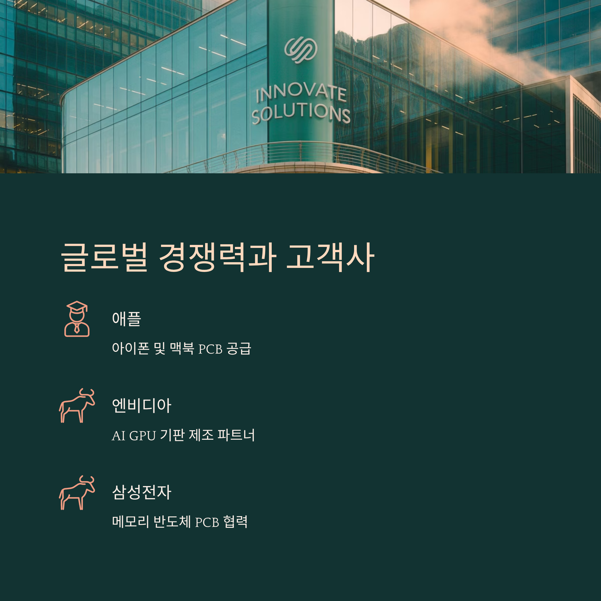 심텍은 삼성전자, SK하이닉스, 인텔, 엔비디아, 퀄컴 등과 거래하고 있는 글로벌 수준의 PCB 제조사예요. 단순히 하청이 아니라, 고객 맞춤형 제품을 설계부터 납품까지 책임지는 전략적 파트너 관계를 유지하고 있답니다.