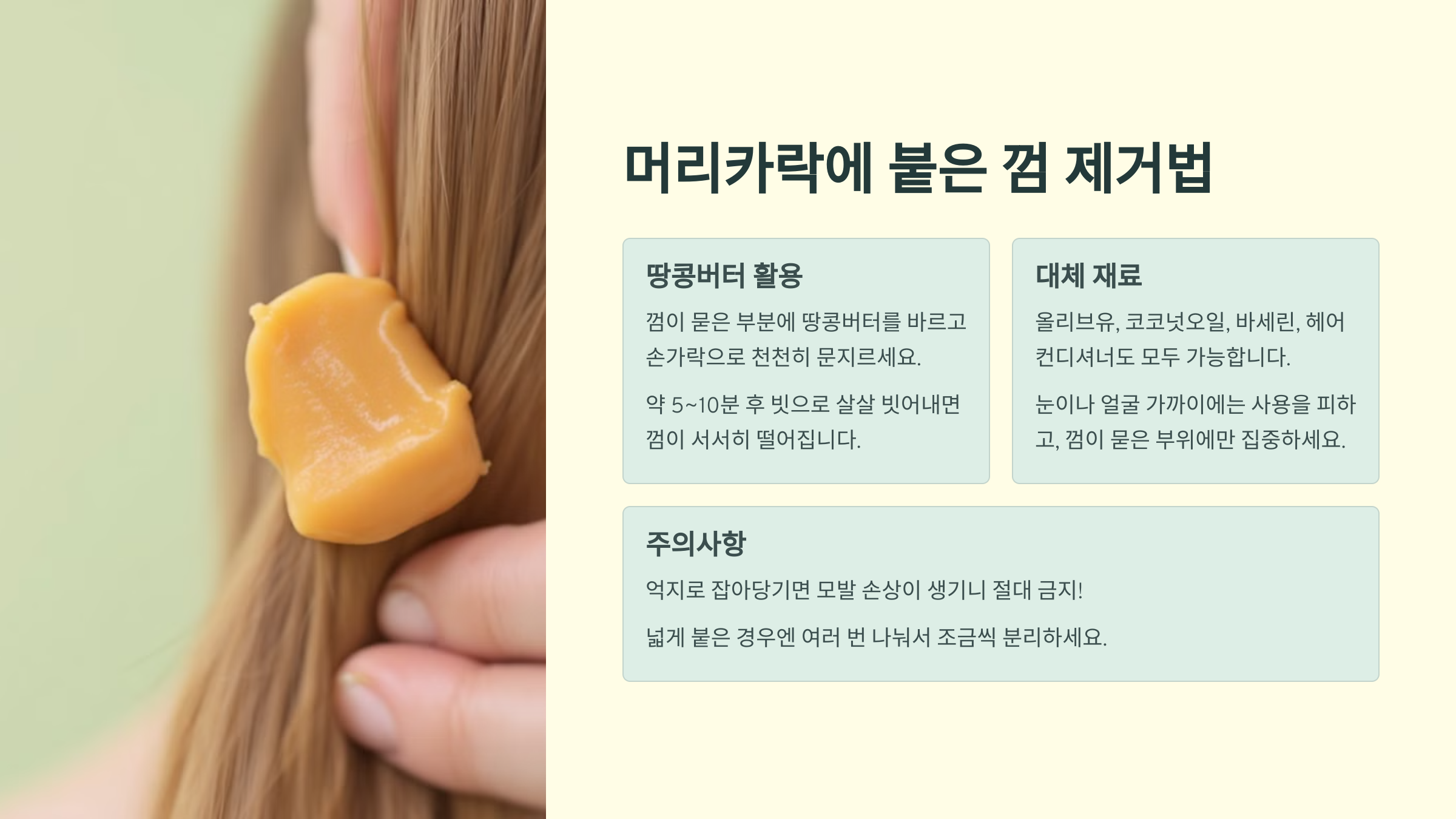 올리브유, 코코넛오일, 바세린, 헤어컨디셔너도 모두 가능해요. 다만 눈이나 얼굴 가까이에는 사용을 피하고, 껌이 묻은 부위에만 집중해서 바르는 게 포인트예요. 억지로 잡아당기면 모발 손상이 생기니까 절대 금지!