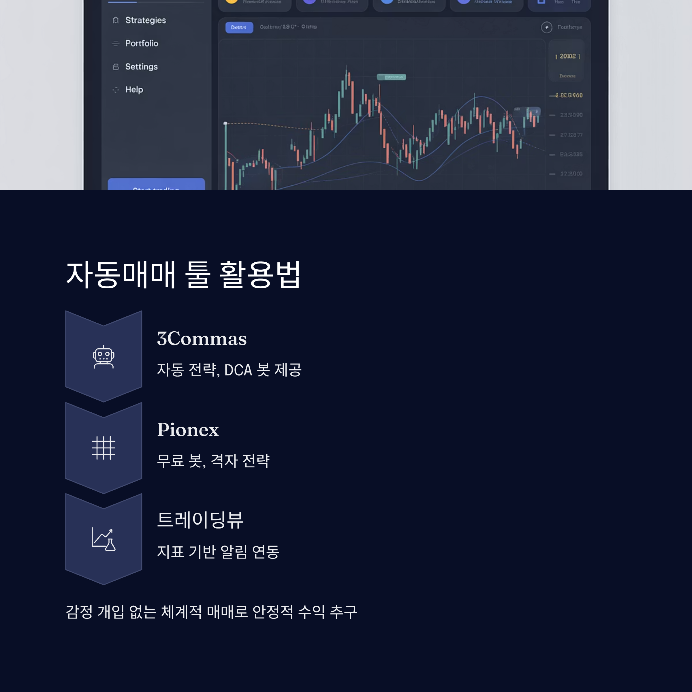 가장 많이 사용되는 자동매매 툴로는 트레이딩뷰 알림 연동, 3Commas, Pionex, 바이낸스 자동주문 기능 등이 있어요. 이 툴들은 조건부 주문, 트레일링 스탑, 포트폴리오 자동 조정 등의 기능을 제공해요.