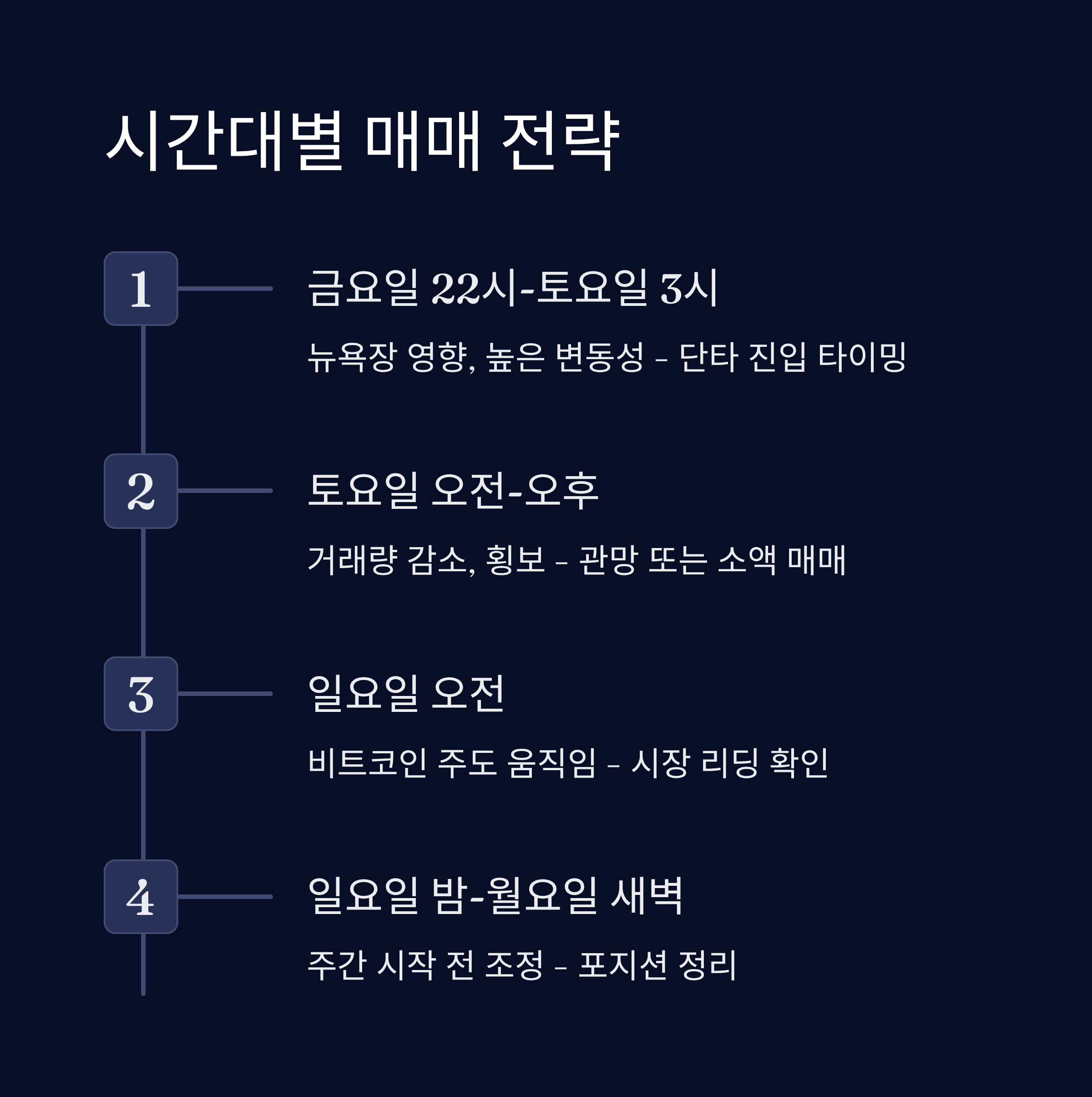 일요일 밤은 다음 주 시장을 준비하는 트레이더들이 다시 등장하면서 거래량이 증가해요. 특히 미국 투자자들이 다시 시장에 들어오기 시작하는 시간이라, 이 시점부터는 변동성이 살아나는 경우가 많아요. 이때를 활용해서 수익 실현이나 포지션 정리를 고려할 수 있어요.