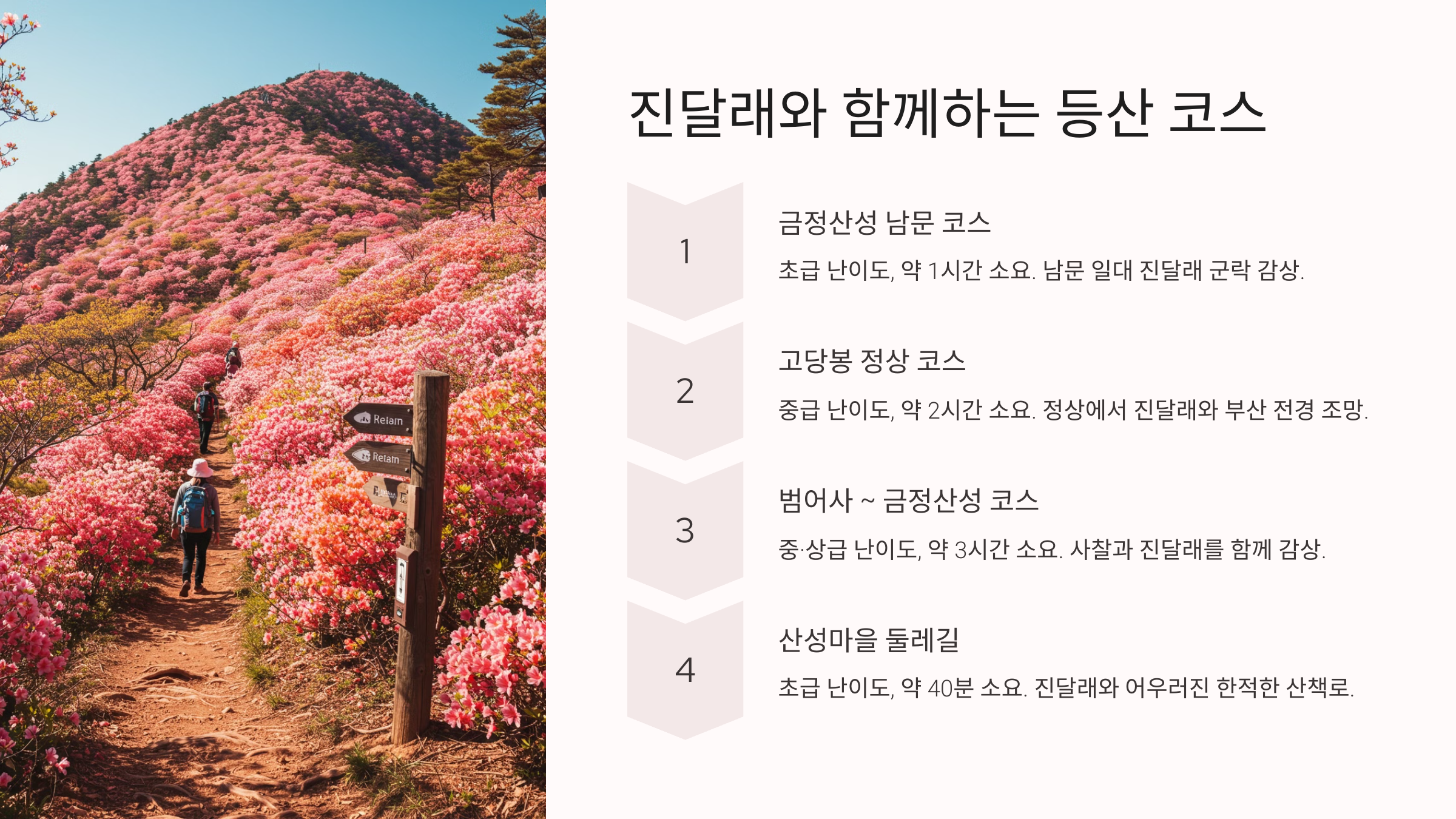 | 금정산성 남문 코스 | 초급 | 약 1시간 | 남문 일대 진달래 군락 감상 |