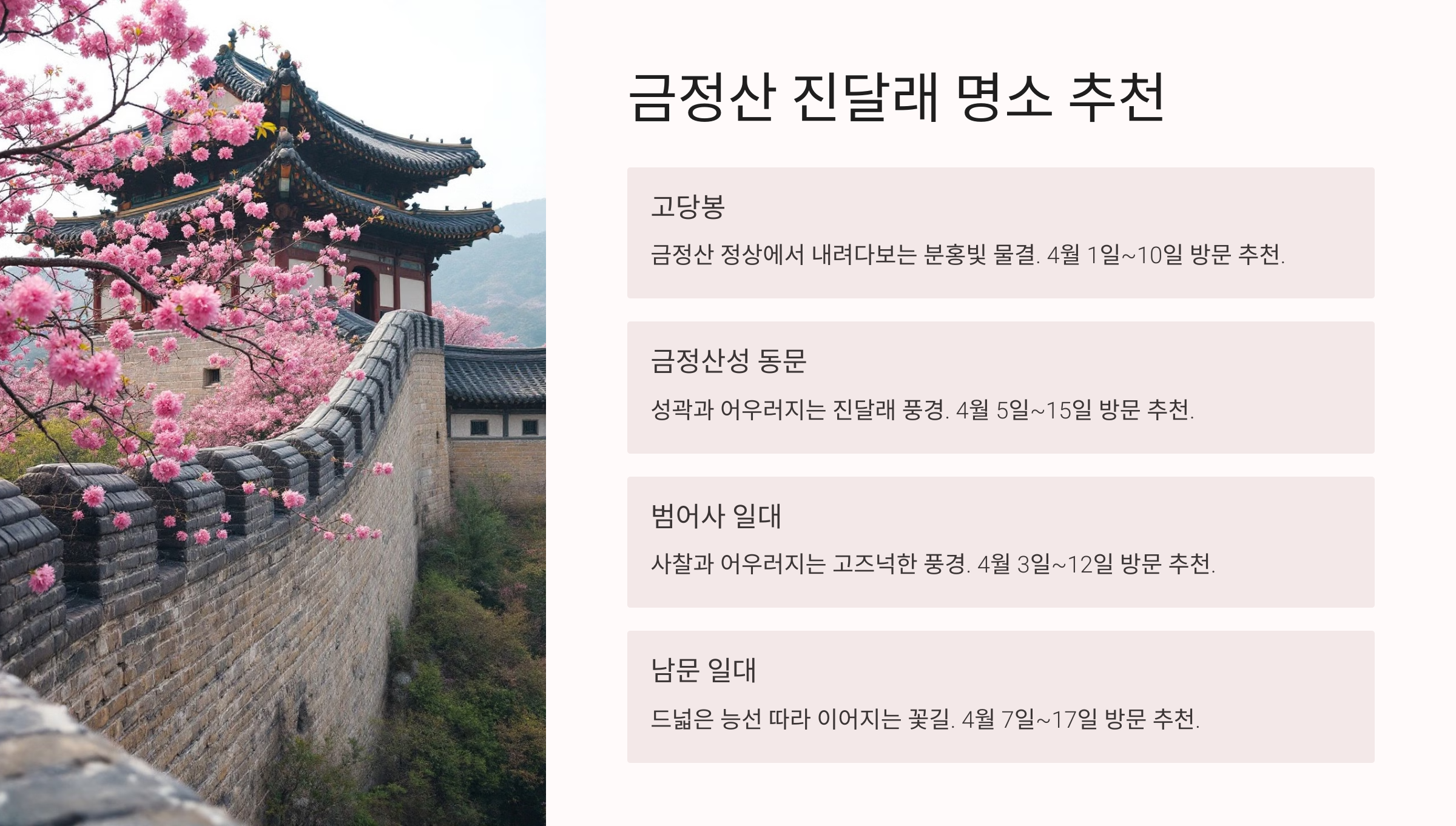 진달래를 가장 아름답게 감상하려면 4월 5일~15일 사이에 방문하는 것이 좋아요! 이 시기에는 금정산이 온통 분홍빛으로 물들어 환상적인 장관을 연출한답니다. 🌸