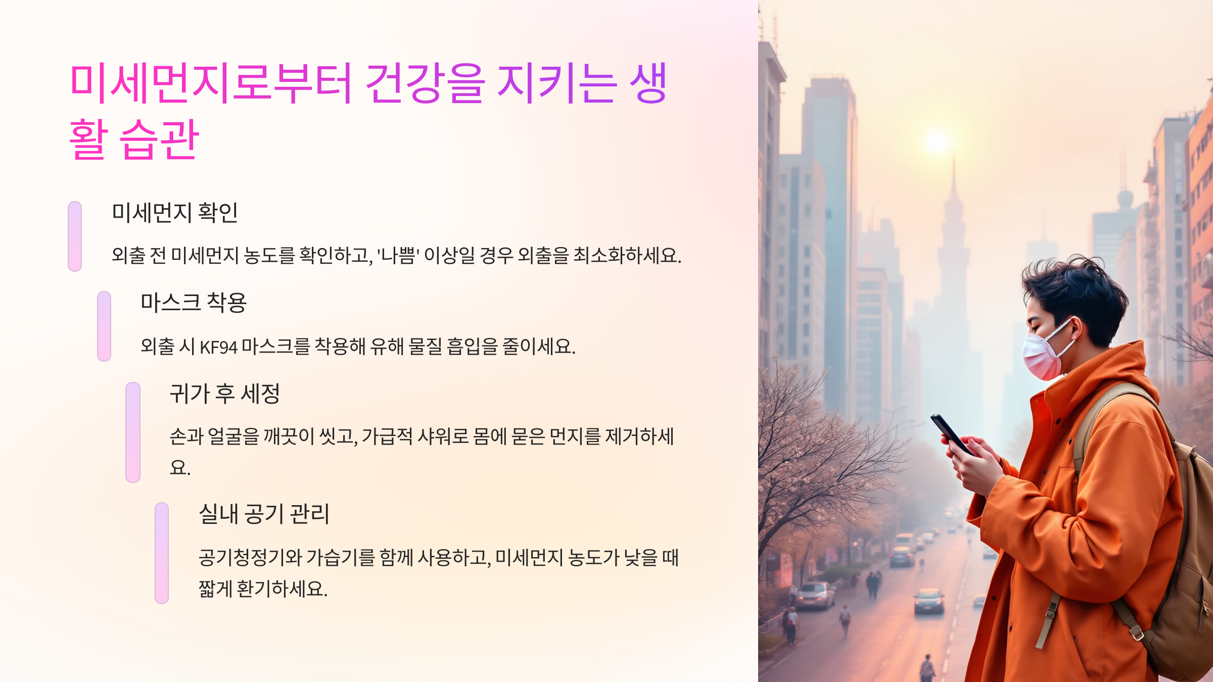 미세먼지가 심한 날에는 단순히 마스크를 착용하는 것만으로는 부족해요. 생활 속에서 미세먼지를 줄이고 몸을 보호하는 습관을 실천하는 것이 중요해요.
