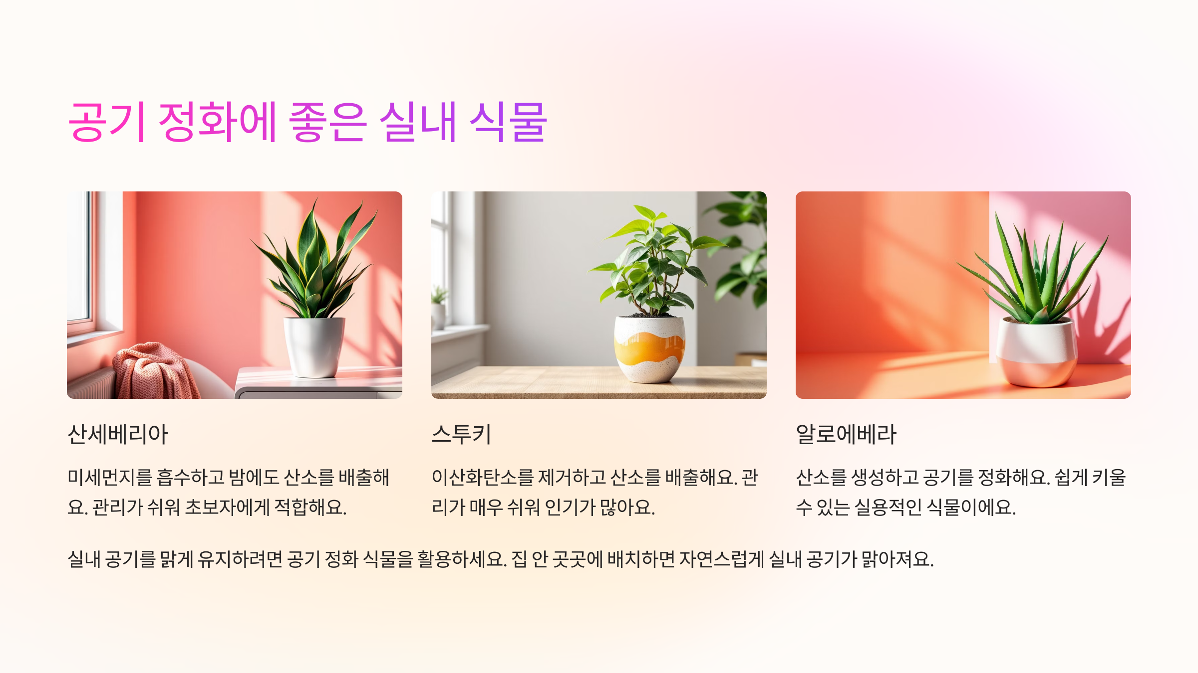 📌 이제 공기 정화에 좋은 실내 식물을 알아볼게요... 이어서 출력