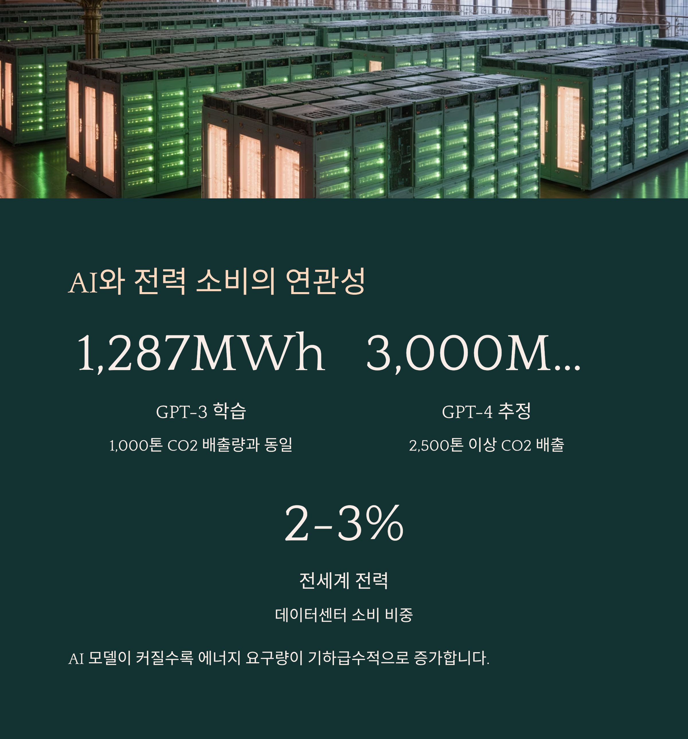 인공지능의 발전은 엄청난 계산 능력을 필요로 해요. 이 계산을 위해 대규모 데이터센터가 24시간 가동되고, 자연스럽게 막대한 전력이 소모돼요. 우리가 챗봇 하나 사용하는 것처럼 보이지만, 그 뒤엔 수천 개의 서버가 동시에 돌아가고 있는 거죠.